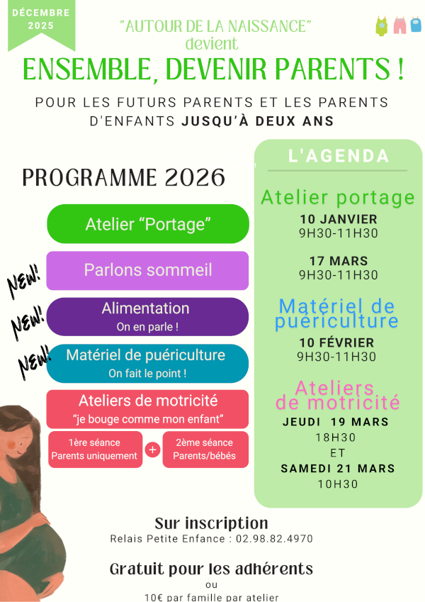 Hamac et trampoline à Pont-l’Abbé propose aux futurs parents et parents d’enfants jusqu’à 2 ans, un parcours conçu pour les accompagner au travers d’ateliers "portage", sur le sommeil, l’alimentation, le matériel de puériculture, de motricité.