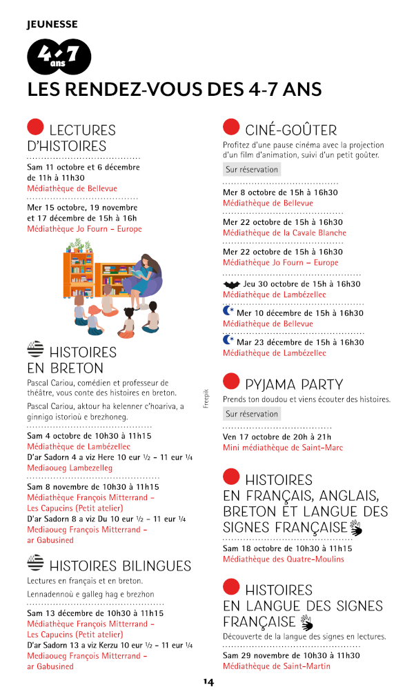 A Brest, les médiathécaires proposent aux enfants de 4 à/7 ans les rendez-vous des 4/7 ans avec des lectures d’histoires (en français, en breton, en LSF), des pyjamas parties, des cinés-goûters