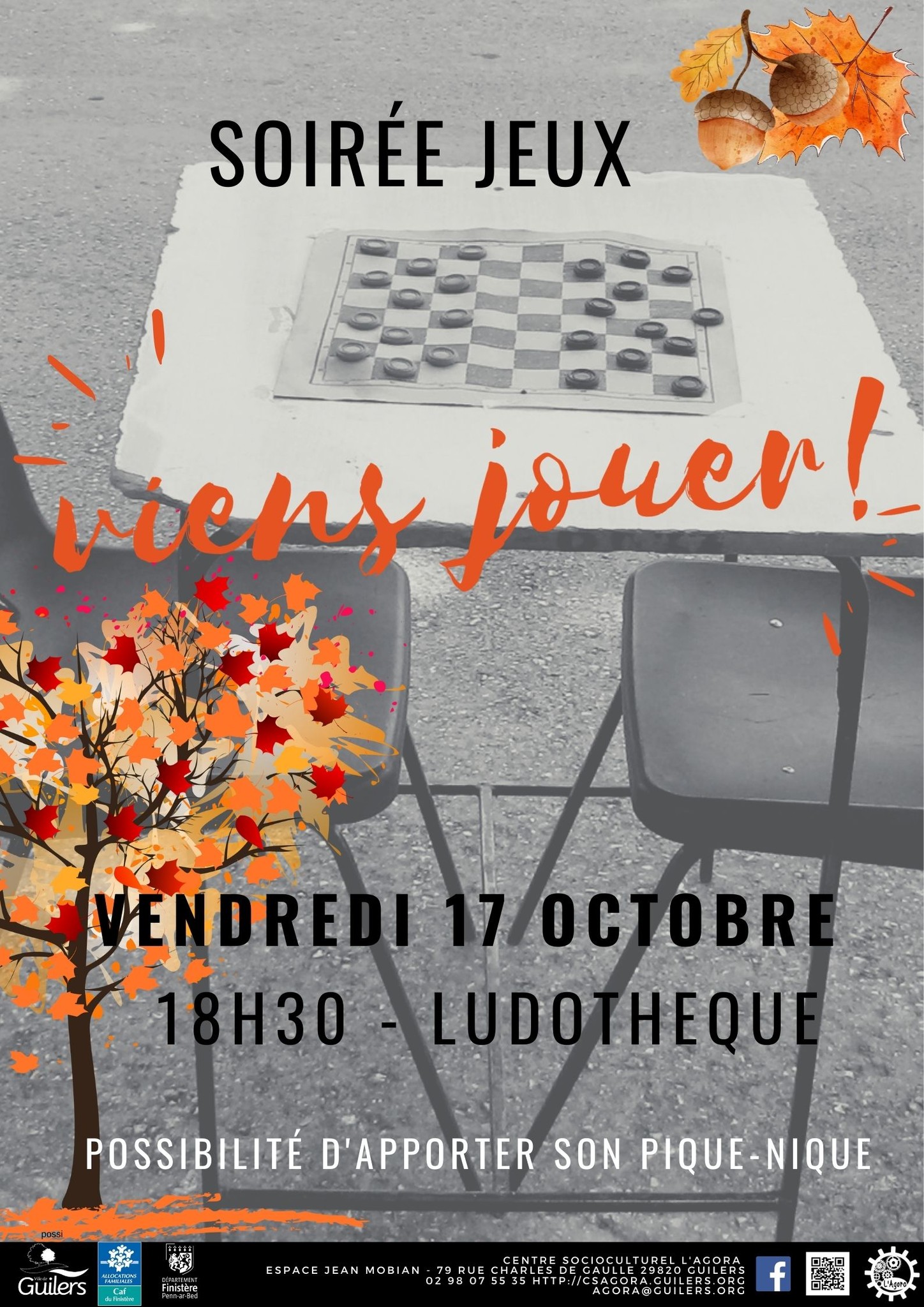 Soirée jeux à Guilers Vendredi 17 octobre 2025 | Catégories : Autour de l’enfance, Autour de la jeunesse, Sortir en famille Description Le centre socioculturel Agora à Guilers propose une soirée jeux le 17 octobre 2025 à partir de 18h30. Localisation L’Agora - Guilers