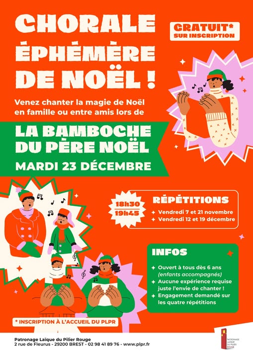 Pour préparer la "Bamboche du Père-Noël" le 23 décembre, le Patronage laïque du Pilier rouge met en place une Chorale Éphémère de Noël avec des répétitions de 18h30 à 19h45 les