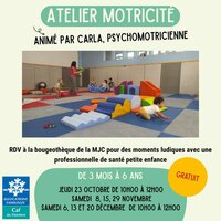 La Bougeothèque : atelier motricité pour les 0/6 ans à Douarnenez Samedi 8 novembre | Catégories : Autour de la naissance, Autour de la petite enfance, Sortir en famille Description À Douarnenez, la MJC Ti an Dud donne rendez-vous aux parents avec leurs enfants de 0 à 6 ans sur la "Bougeothèque", un atelier motricité animé par une psychomotricienne. Gratuit Localisation Ti An Dud - Douarnenez