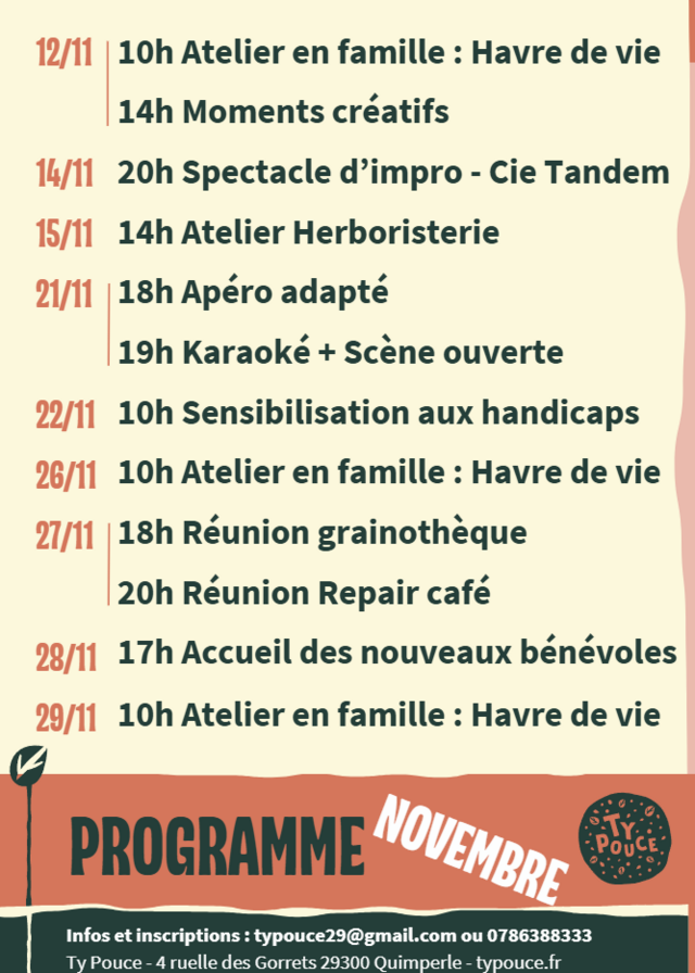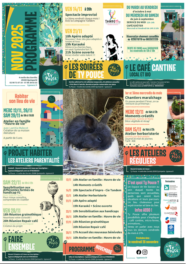 Ateliers famille, ateliers parentalité, soirées Ty Pouce... à Quimperlé Vendredi 14 novembre | Catégories : Autour de l’enfance, Face au handicap, Sortir en famille, Aide aux parents Description Ty pouce à Quimperlé propose diverses activités pour les familles ou pour les parents en novembre avec notamment les ateliers en famille "Havre de vie", les soirées de Ty pouce, les ateliers parentalité... Localisation Ty Pouce - Quimperlé