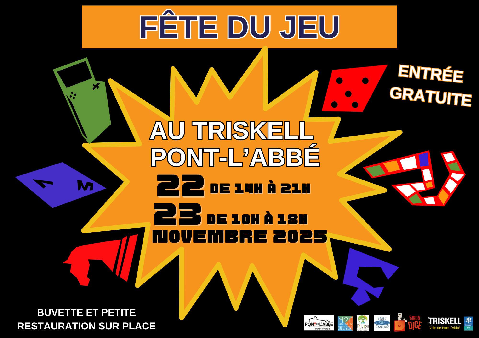 Fête du jeu à Pont l’Abbé Dimanche 23 novembre | Catégories : Autour de l’enfance, Autour de la jeunesse, Sortir en famille Description Les 22 et 23 novembre se déroule la fête du jeu au Triskell à Pont l’Abbé Localisation Le Triskell - Pont l’Abbé