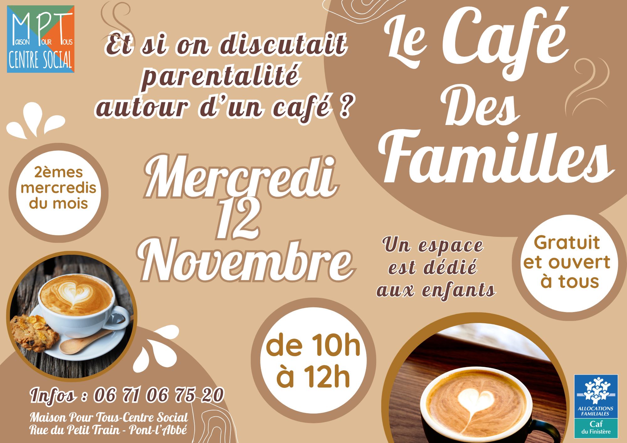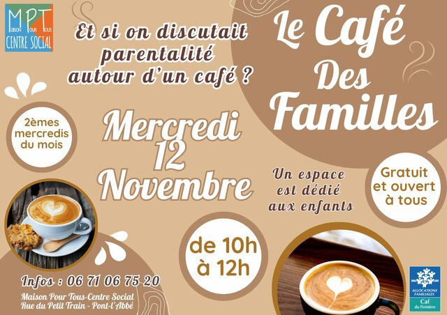 Le café des familles : discuter parentalité autour d’un café à Pont l’Abbé Mercredi 12 novembre | Catégories : Aide aux parents Description La MPT centre social de Pont l’Abbé propose tous les 2es mercredis du mois "Le café des familles" En novembre RDV de 10h à 12h le mercredi 12 novembre. Gratuit et ouvert à tous. Infos : 06 71 06 75 20 Localisation MPT - Pont l’Abbé