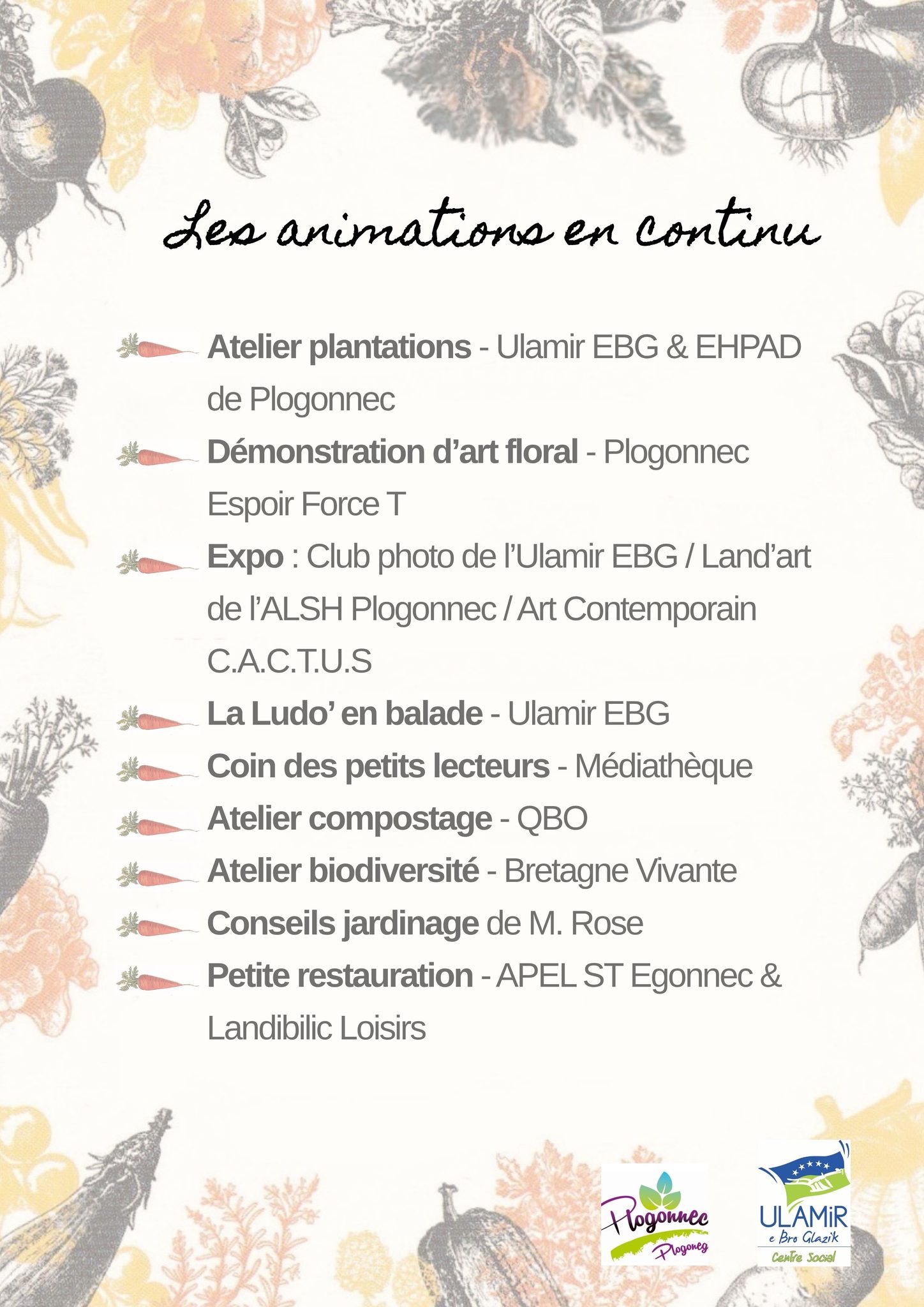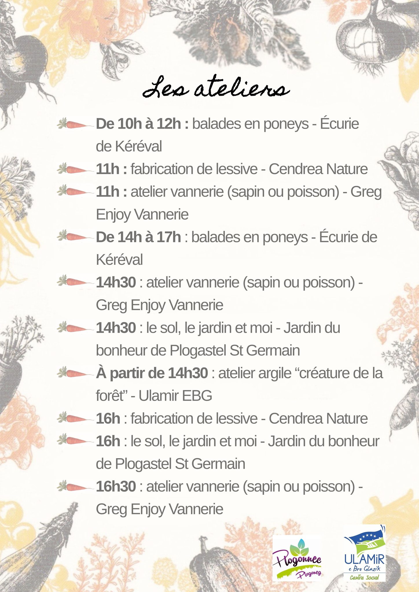 "Vide jardin" : vent d’animations sur Plogonnec, Plonéis... Dimanche 16 novembre | Catégories : Sortir en famille Description L’Ulamir organise en partenariat avec la Mairie de Plogonnec le dimanche 16 novembre un vide jardin ! Dans le cadre de cet évènement de nombreux ateliers et animations sont proposés aux petits et grands Renseignements : 02 98 91 14 21 Localisation Plogonnec, Plonéis...