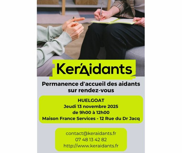 Permanence Ker’aidants à Huelgoat : un appui pour les aidants Jeudi 13 novembre | Catégories : Face au handicap, Place aux grands-parents Description Une permanence de Ker’Aidants se tient jeudi 13 novembre 2025 de 9h à 12h à la Maison France Services de Huelgoat. Sur rendez-vous. Prendre rendez-vous : 07 48 13 42 82 / contact@keraidants.fr Localisation Maison France Services - Huelgoat
