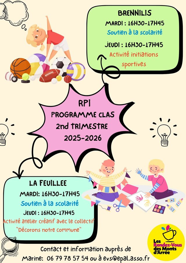 Soutien à la scolarité : Programme Clas à Brennilis et La Feuillée Jeudi 25 décembre | Catégories : Autour de l’école Description Les rendez-vous des Monts d’Arrée propose dans le cadre du RPI (Regroupement Pédagogique Intercommunal), des temps de soutien à la scolarité avec le programme CLAS à Brennilis et La Feuillée. Localisation Brennilis et La Feuillée
