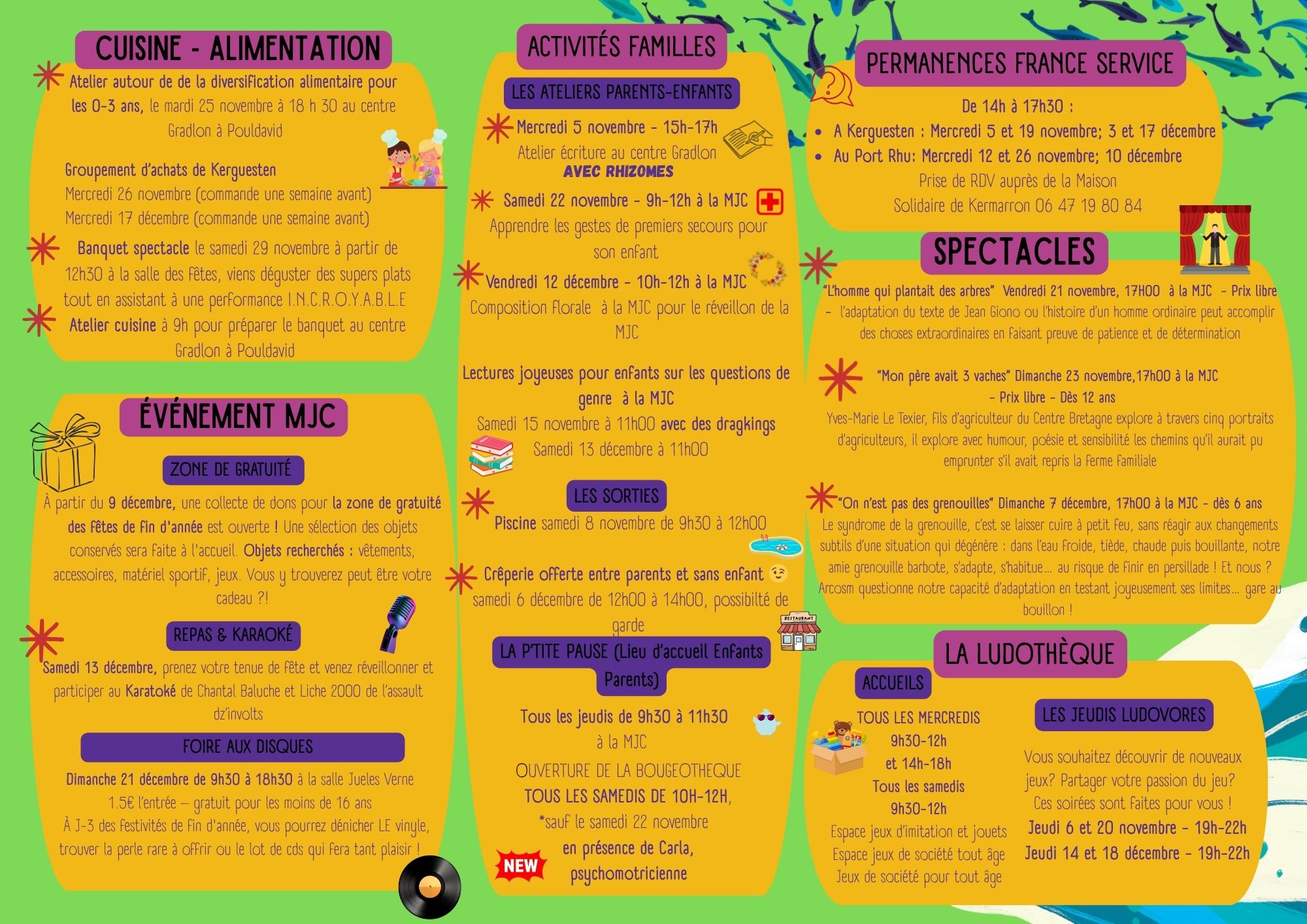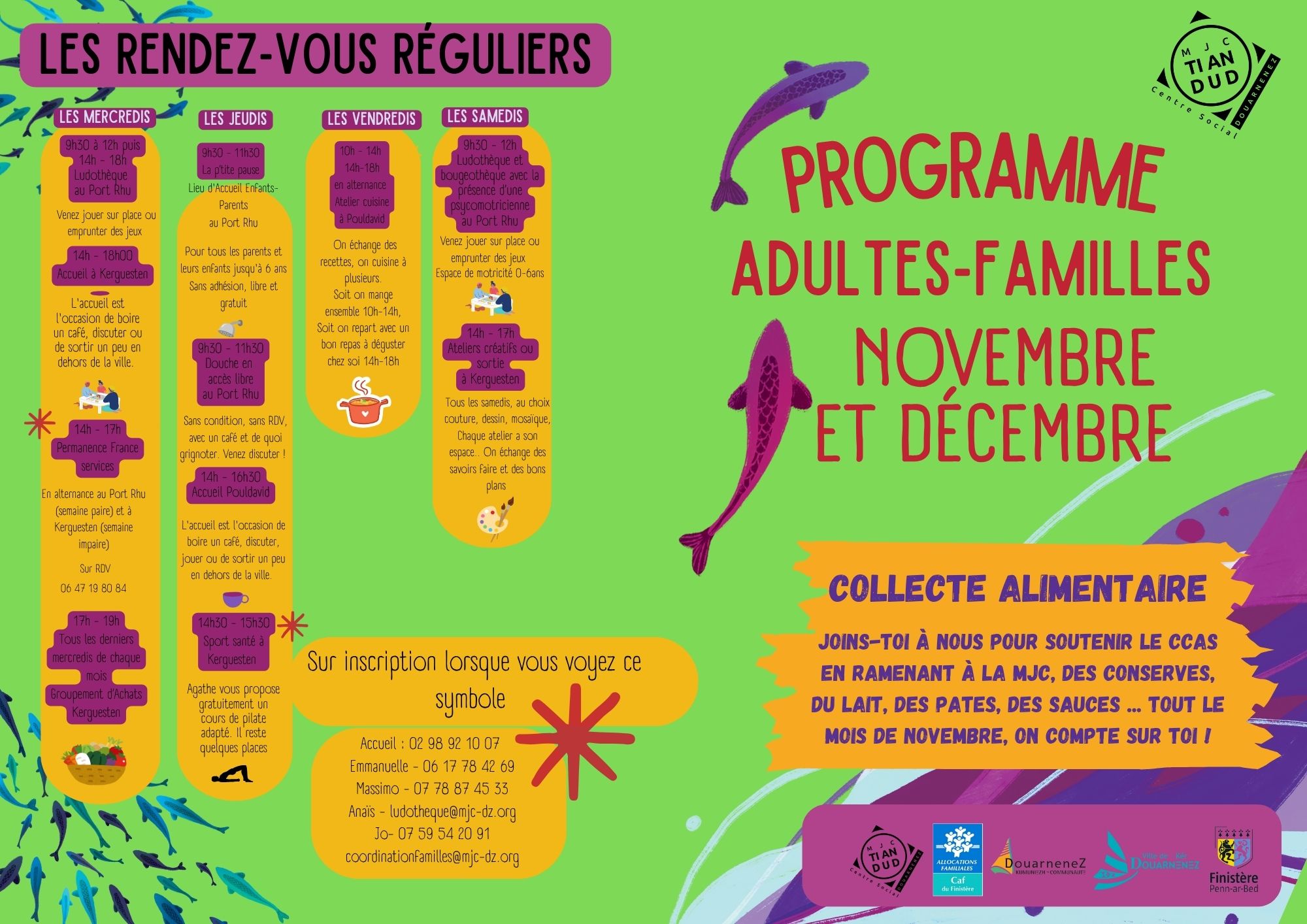 Ateliers parents/enfants, atelier diversification alimentaire, spectacles, ludothèque... les RDV pour les familles à Douarnenez Dimanche 7 décembre | Catégories : Autour de la petite enfance, Autour de l’enfance, Sortir en famille Description Entre rendez-vous réguliers et propositions ponctuelles, la MJC de Douarnenez propose aux familles de nombreuses activités. En novembre et décembre : Localisation Ti An Dud - Douarnenez