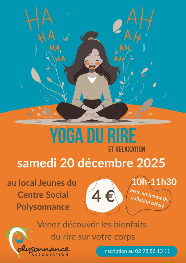 Yoga du rire et relaxation à Châteaulin Samedi 20 décembre | Catégories : Autour de la jeunesse, Sortir en famille Description Polysonnance à Châteaulin propose une séance yoga du rire et relaxation samedi 20 décembre de 10h à 11h30 au local jeunes. "Venez découvrir les bienfaits du rire sur votre corps" Localisation Local jeunes - Ploysonnance - Châteaulin