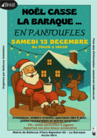 Animations et spectacle "Noël casse la Baraque... en pantoufles" à Brest - Bellevue Samedi 13 décembre | Catégories : Autour de la petite enfance, Autour de l’enfance, Sortir en famille Description Samedi 13 décembre de 14h30 à 18h30, c’est la fête à la Baraque à Brest (Mairie de Bellevue - La Baraque) avec animations, ateliers créatifs, spectacles, petite restauration et autres surprises. 17h : défilé pantoufles et pyjamas. Accès libre. Localisation La Baraque - Brest