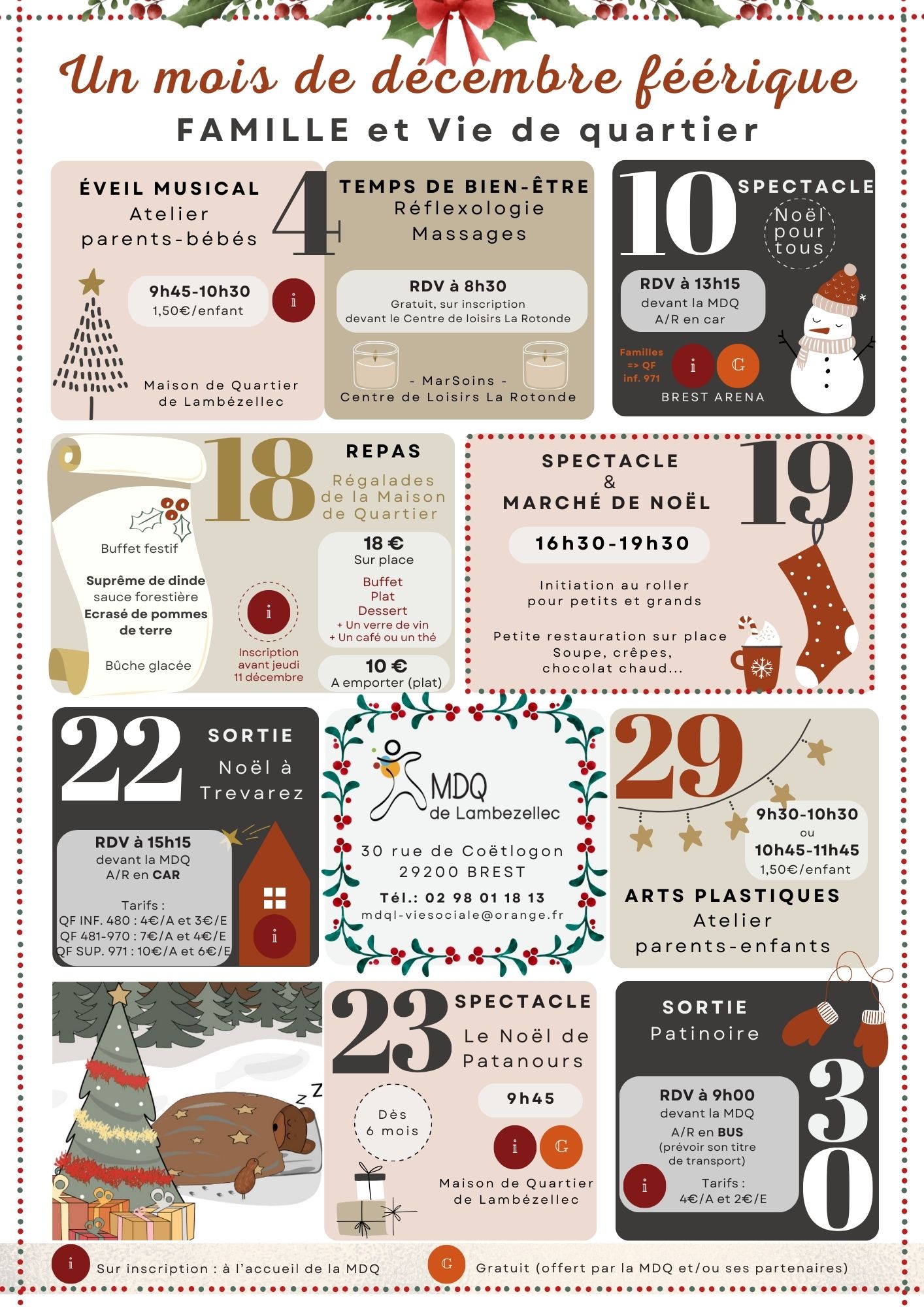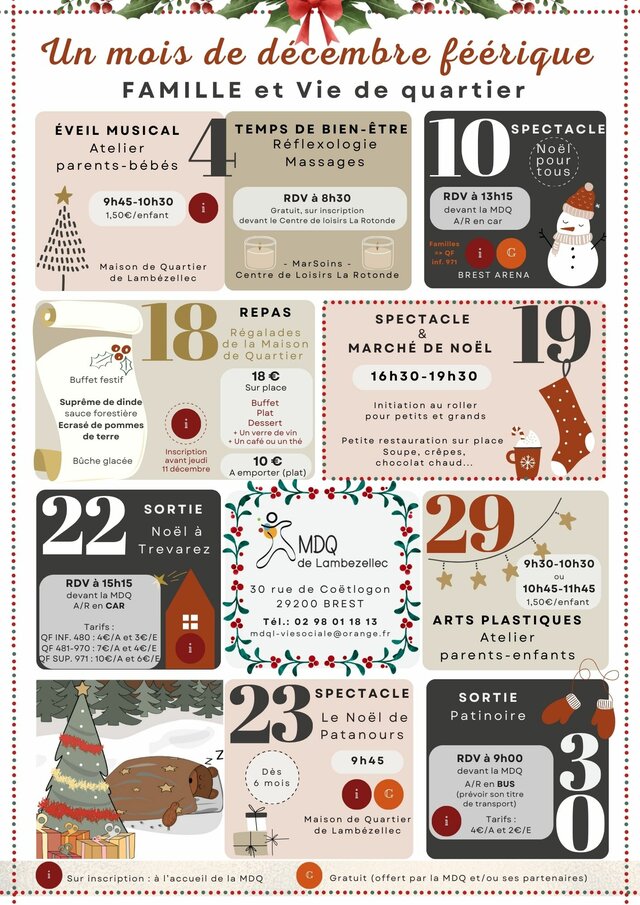 Ateliers parents/bébés, bien-être, spectacles, sorties... : le programme de la MDQ à Lambé Jeudi 4 décembre | Catégories : Autour de la petite enfance, Autour de l’enfance, Autour de la jeunesse, Sortir en famille Description En décembre, la Maison de Quartier de Lambézellec à Brest réserve des activités et animations pour un mois féérique. Renseignements et inscriptions MDQ Lambézellec 02 98 01 18 13