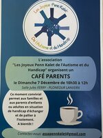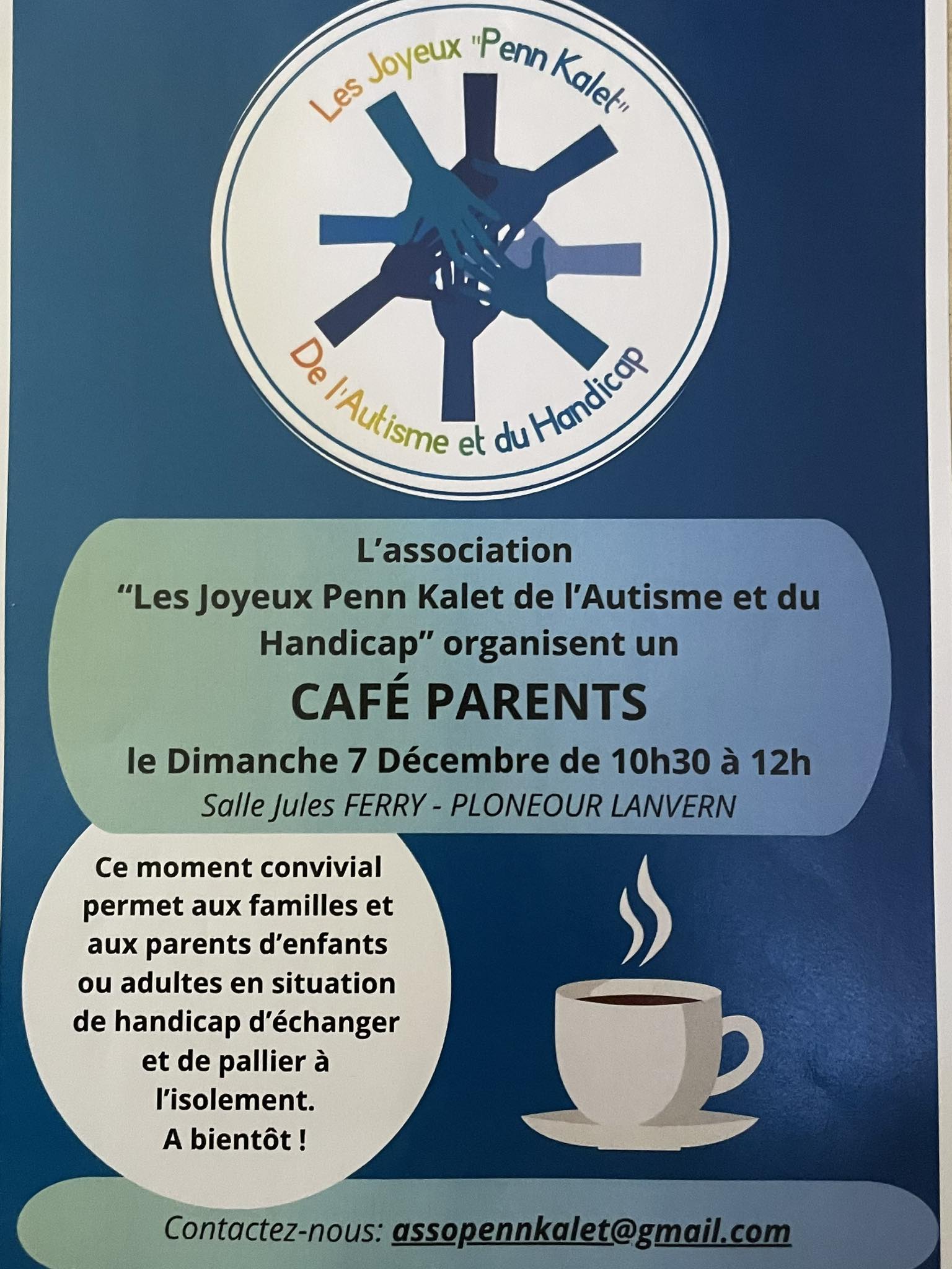 Café des parents pour échanger autour du handicap et pallier à l’isolement Dimanche 7 décembre | Catégories : Face au handicap, Aide aux parents Description L’association "Les joyeux Penn Kalet de l’autisme et du handicap" organise un café des parents Dimanche 7 décembre de 10h30 à 12h à Plounéour-Lanvern. Localisation Salle Jules Ferry - Plounéour-Lanvern
