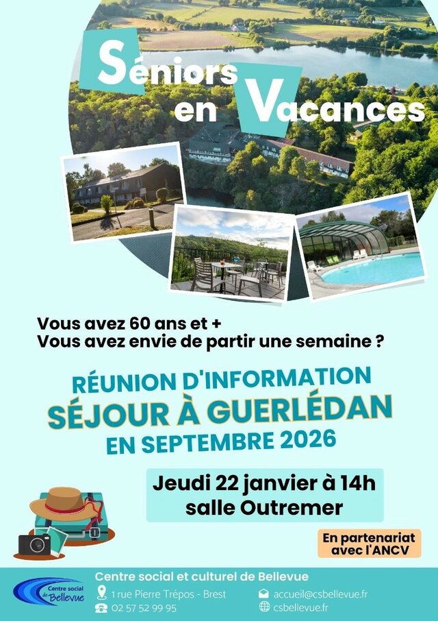 Séjour séniors : réunion d’information à Bellevue - Brest Jeudi 22 janvier | Catégories : Place aux grands-parents Description Le Centre social de Bellevue à Brest organise un séjour seniors (pour les 60 ans et +) à Guerlédan en septembre 2026. "Venez vous renseigner lors de la réunion d’information Jeudi 22 janvier à 14h, salle Outremer." Localisation Centre social de Bellevue - Brest