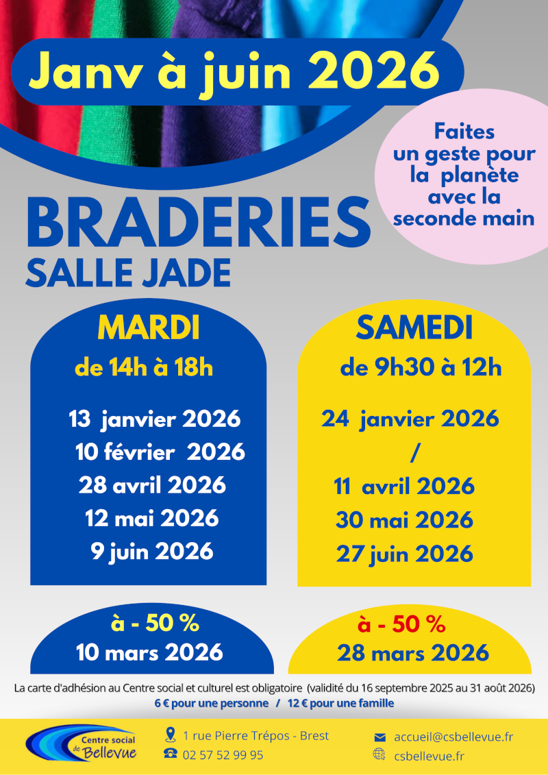 Braderie de vêtements au centre social de Bellevue - Brest Mardi 13 janvier | Catégories : Aide aux parents Description Le centre social de Bellevue à Brest organise une braderie de vêtements, occasion de s’équiper ou compléter les tenues de la famille à petits prix : Localisation Centre social de Bellevue - Brest