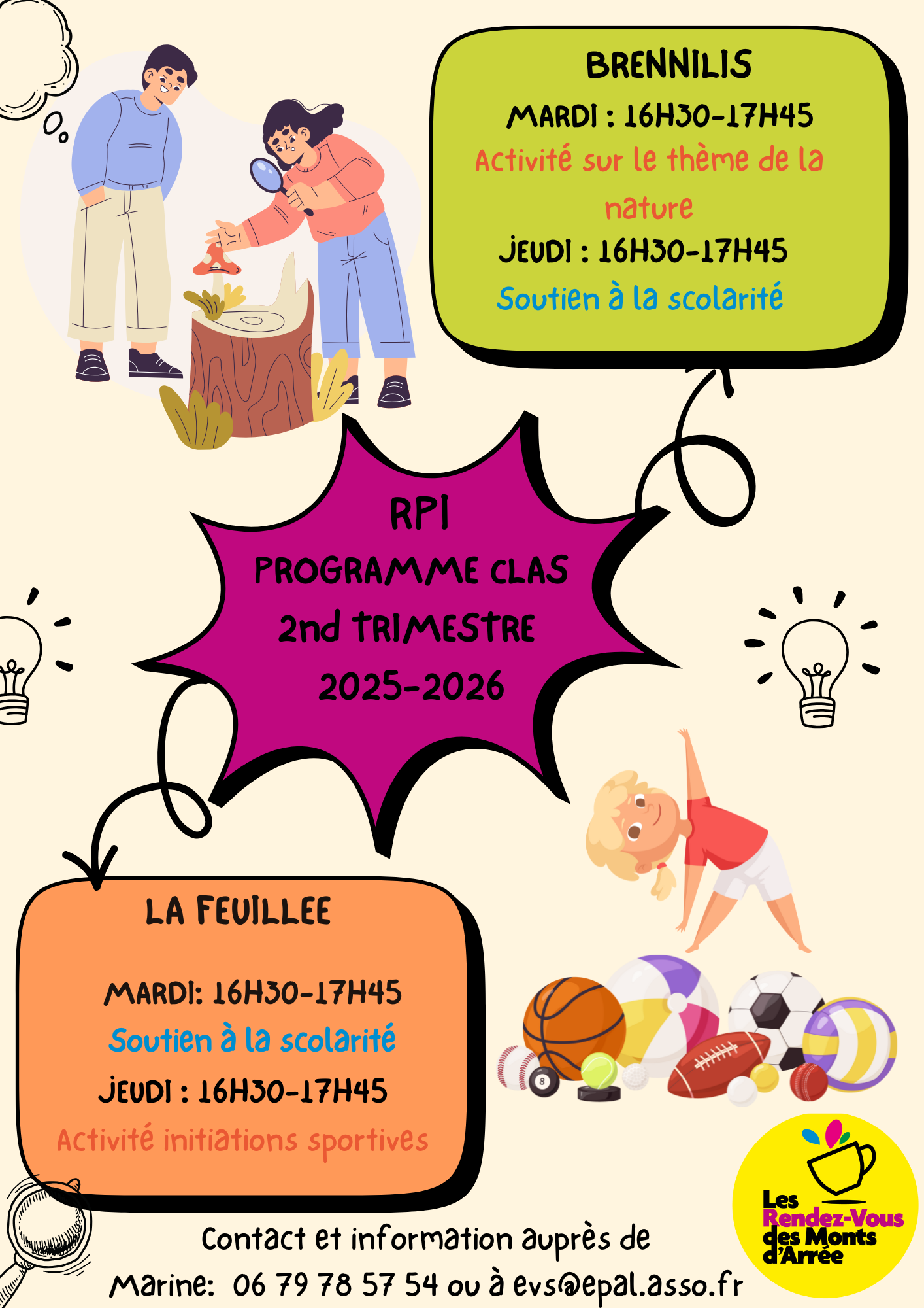 Programme Clas à Brennilis et La Feuillée Jeudi 8 janvier | Catégories : Autour de l’école Description Les rendez-vous des Monts d’Arrée propose dans le cadre du RPI (Regroupement Pédagogique Intercommunal), des temps de soutien à la scolarité avec le programme CLAS à Brennilis et La Feuillée. Localisation Brennilis et La Feuillée