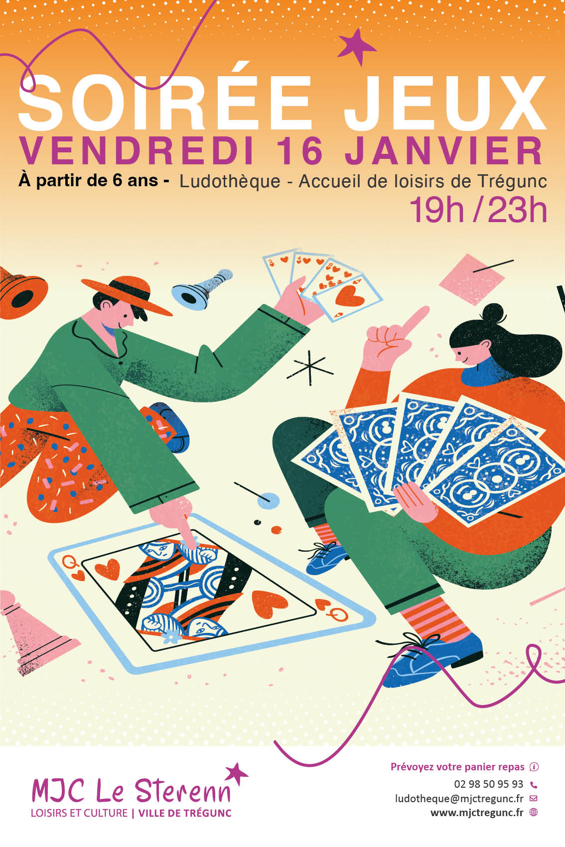 Soirée jeux à Trégunc Vendredi 16 janvier | Catégories : Autour de l’enfance, Autour de la jeunesse, Sortir en famille Description La ludothèque de la MJC Le Sterenn à Tregunc propose de se retrouver de 19h/23h pour une soirée jeux entre amis, en famille, seul ou à plusieurs. Infos : 02 98 50 95 93 / ludotheque@mjctregunc.fr Localisation Ludothèque MJC Le Sterenn Trégunc
