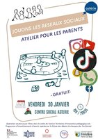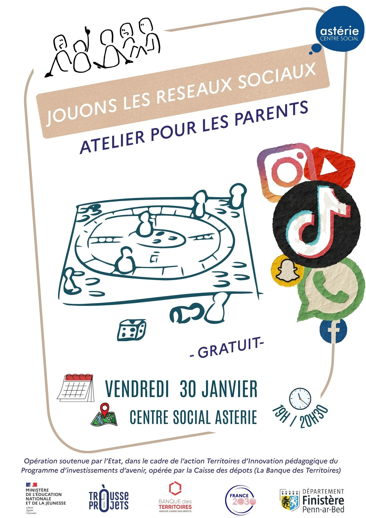 "Jouons les réseaux sociaux" Atelier pour les parents à Plougastel-Daoulas Vendredi 30 janvier | Catégories : Protéger les enfants, Aide aux parents Description Le centre social Astérie à Plougastel-Daoulas propose un atelier pour les parents sur "Jouons les réseaux sociaux" Vendredi 30 janvier de 19h à 20h30 Gratuit. Renseignements : 02 98 37 57 35 Localisation Astérie - Plougastel-Daoulas