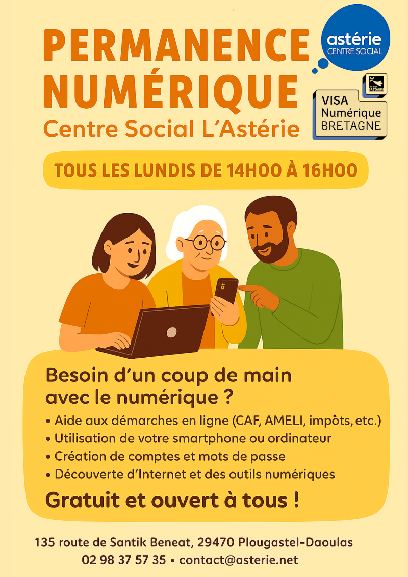 Coup de main autour du numérique ? Permanence numérique à Plougastel Lundi 19 janvier | Catégories : Protéger les enfants, Aide aux parents, Place aux grands-parents Description Pour un coup de main avec le numérique (aide aux démarches en ligne, utilisation du smartphone ou de l’ordinateur, découverte d’internet...) l’Astérie à Plougastel assure le lundi de 14h à 16h une permanence numérique. Gratuit - Ouvert à tous. Localisation Astérie - Plougastel-Daoulas