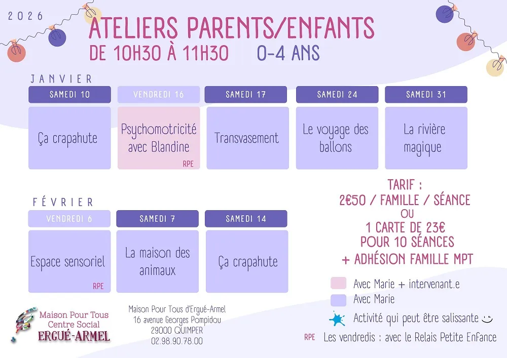 Tarif : 2,50€ par famille et par atelier - ou carte de 10 séances 23€ (+ adhésion à la MPT)