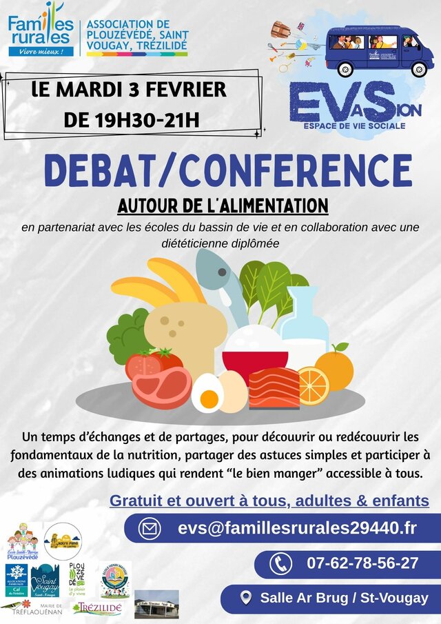 Débat-Conférence autour de l’alimentation Mardi 3 février | Catégories : Protéger les enfants, Aide aux parents Description L’association Familles rurales de Pouzévédé/St-Vougay/Trézilidé organise un débat-conférence autour de l’alimentation Mardi 3 février de 19h30 à 21h Salle Ar Brug à Saint-Vouguay Localisation Salle Ar Brug - Saint-Vougay