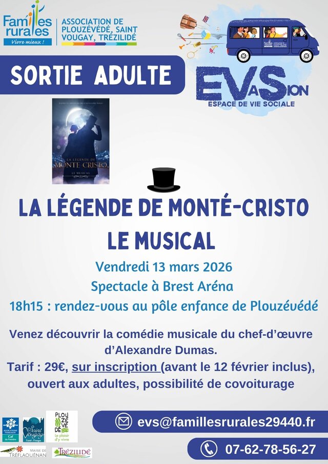 Sortie avec Familles rurales de Pouzévédé/St-Vougay/Trézilidé : Monté-Cristo Le musical Vendredi 13 mars | Catégories : Place aux grands-parents Description L’association Familles rurales de Pouzévédé/St-Vougay/Trézilidé organise une sortie pour le spectacle La légende de Monté-Cristo - Le Musical Vendredi 13 mars 2026