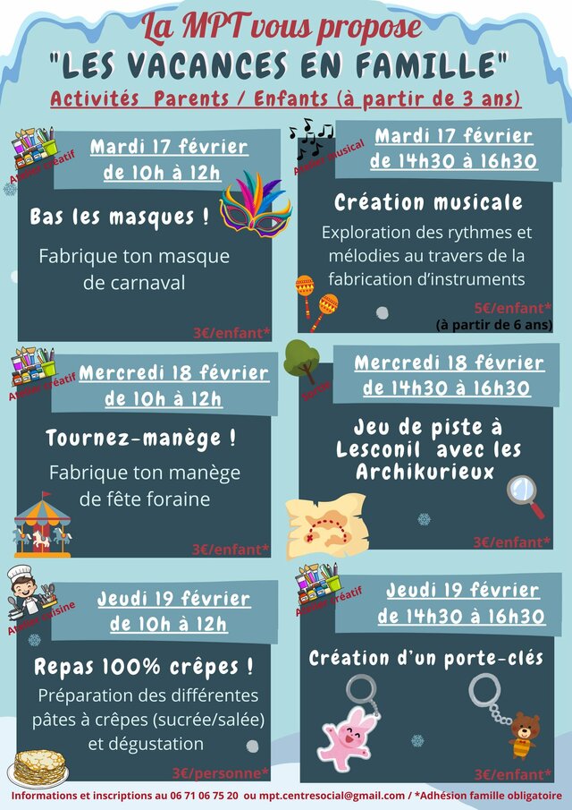 La MPT de Pont l’Abbé met en place son programme des "Vacances en Famille" avec des ateliers parents/enfants (à partir de 3 ans) et des sorties