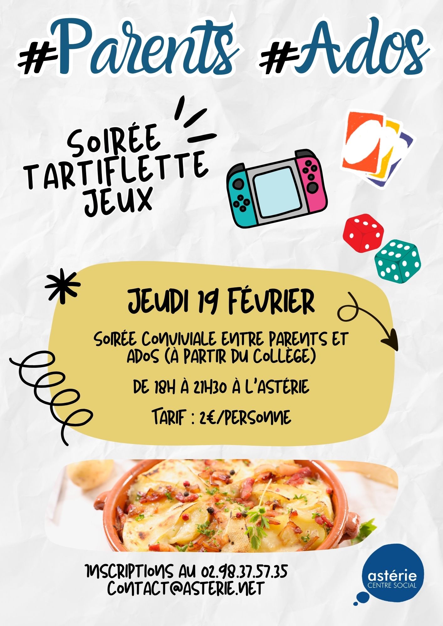 Le centre social Astérie à Plougastel organise une soirée autour d’une tartiflette et de jeux de société pour les ados et leurs parents.