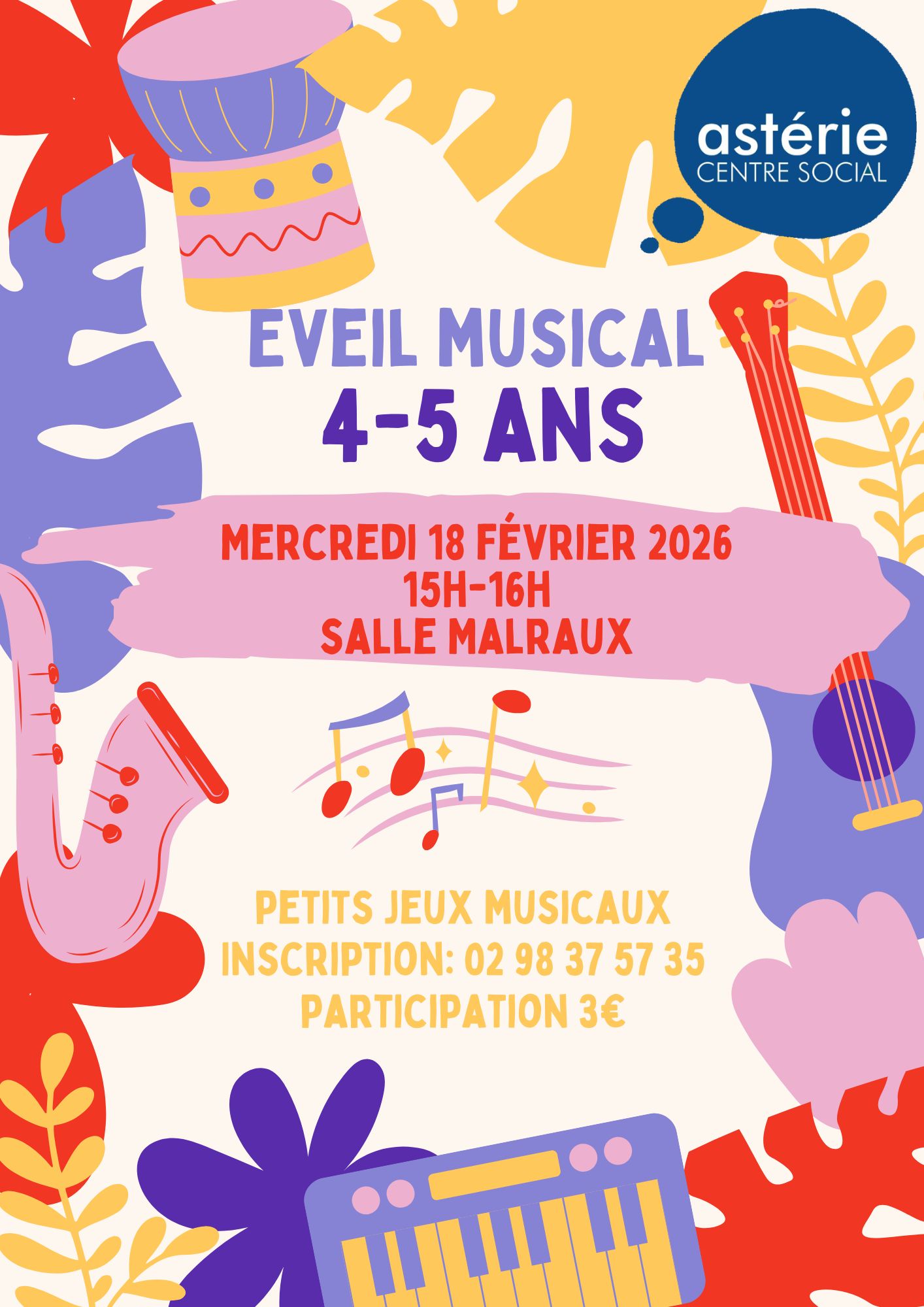Atelier d’éveil musical pour les 4/5 ans à Plougastel Mercredi 18 février | Catégories : Autour de l’enfance Description Le centre social Astérie à Plougastel-Daoulas propose pour les 4/5 ans un atelier d’éveil musical Renseignements et inscriptions : 02 98 37 57 35 Localisation Astérie - Plougastel-Daoulas