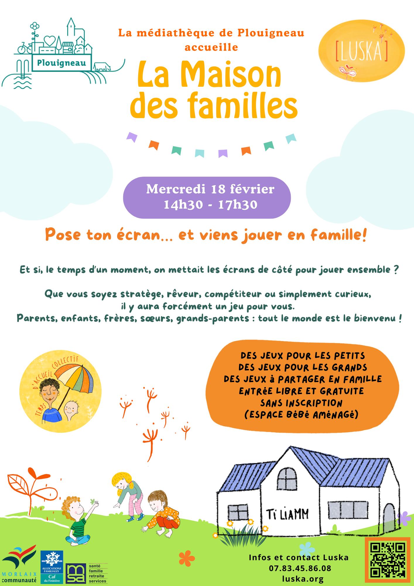 La Maison des familles pour jouer à la médiathèque à Plouigneau Mercredi 18 février | Catégories : Autour de la naissance, Autour de la petite enfance, Autour de l’enfance, Sortir en famille Description La médiathèque de Plouigneau accueille la Maison des familles animé par Luska Liamm pour un temps de jeux et de partage en famille Mercredi 18 février 2026 de 14h30 à 17h30 Localisation Médiathèque - Plouigneau