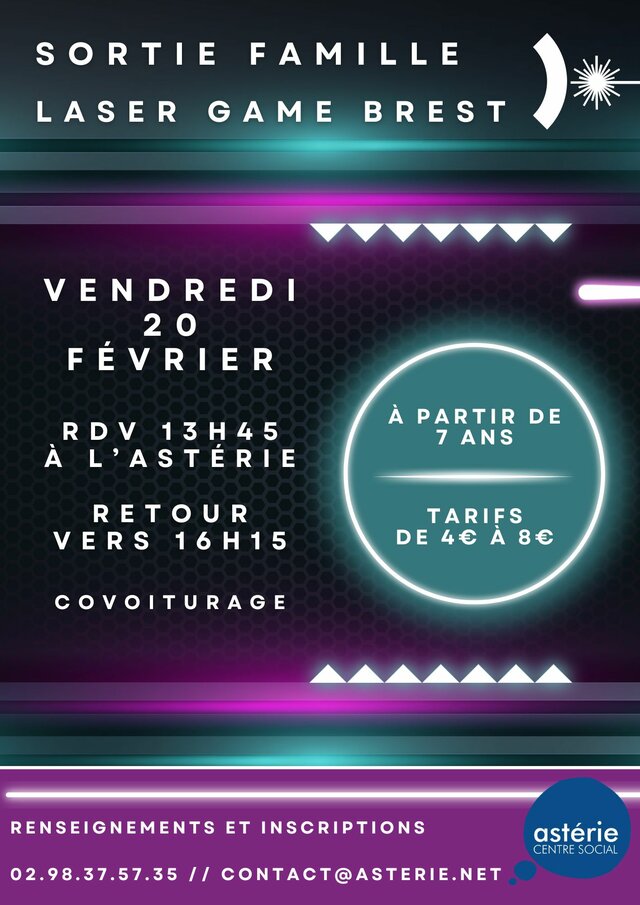 Sortie famille au Laser game avec l’Astérie à Plougastel Vendredi 20 février | Catégories : Autour de l’enfance, Autour de la jeunesse, Sortir en famille Description Le centre social Astérie propose une sortie famille au Laser game de Brest Vendredi 20 février 2026 Renseignements et inscriptions : 02 98 37 57 35 - contact@asterie.net