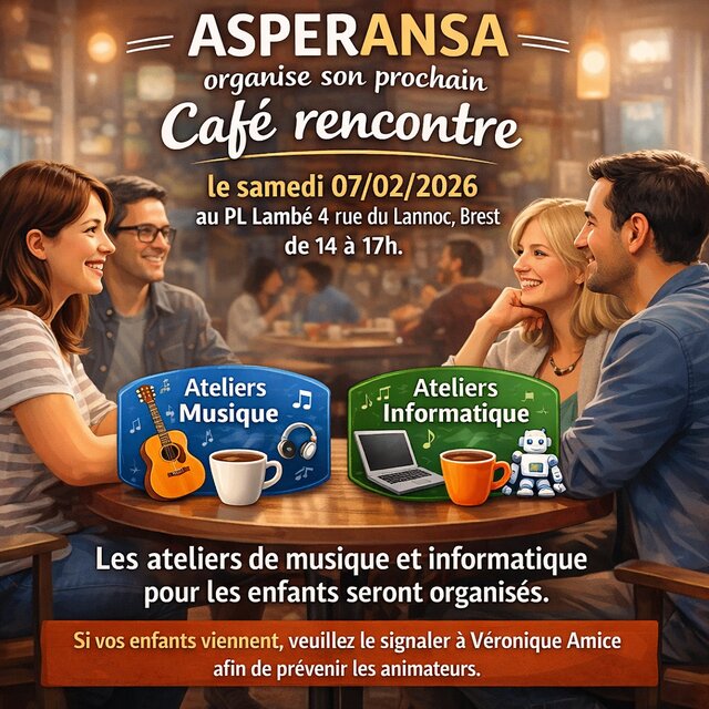 Café rencontre avec Aspéransa à Brest Samedi 7 février | Catégories : Face au handicap, Aide aux parents Description Aspéransa, Association pour la Sensibilisation à la Protection, l’Éducation et la Recherche sur l’Autisme, et Notamment le Syndrome d’Asperger, organise un café rencontre samedi 7 février de 14h à 17h au PL Lambé à Brest Localisation PL Lambé - Brest