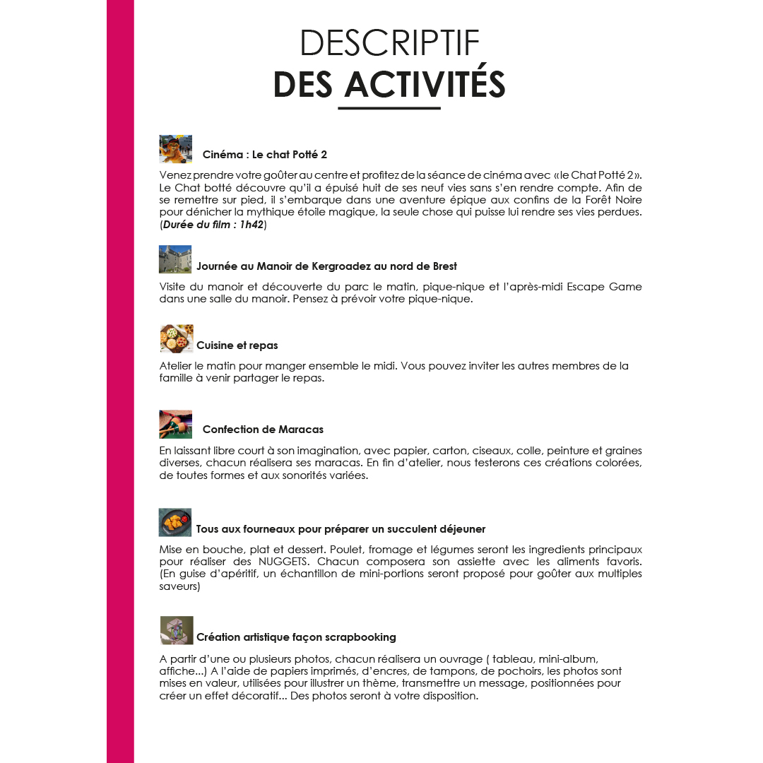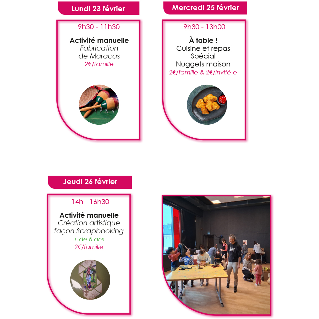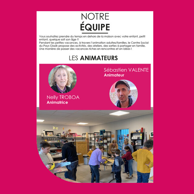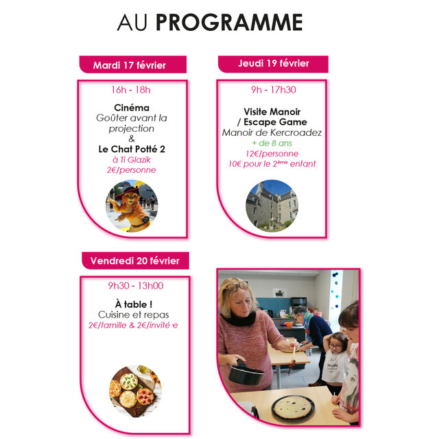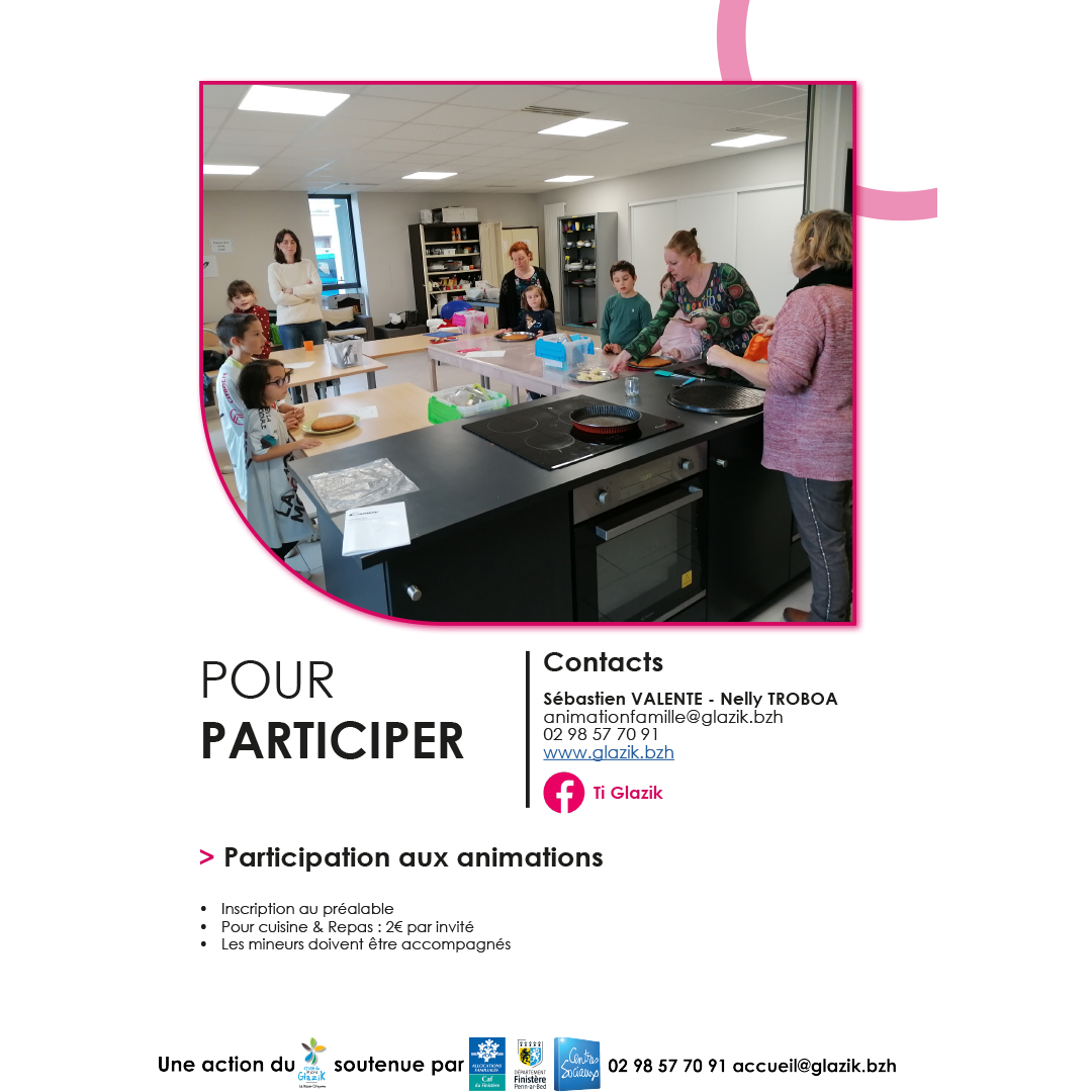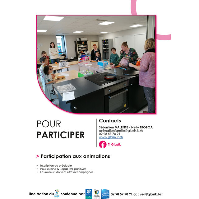Temps conviviaux, créatifs, gourmands et ludiques pour petits et grands à Briec Vendredi 20 février | Catégories : Autour de l’enfance, Autour de la jeunesse, Sortir en famille Description Le Centre Social du Sivom Du Pays Glazik à Briec propose un programme d’activités à partager en famille pendant les vacances. Renseignements & inscriptions : 02 98 57 70 91 / animationfamille@glazik.bzh Localisation Ti Glazik Centre social Pays Glazik - Briec