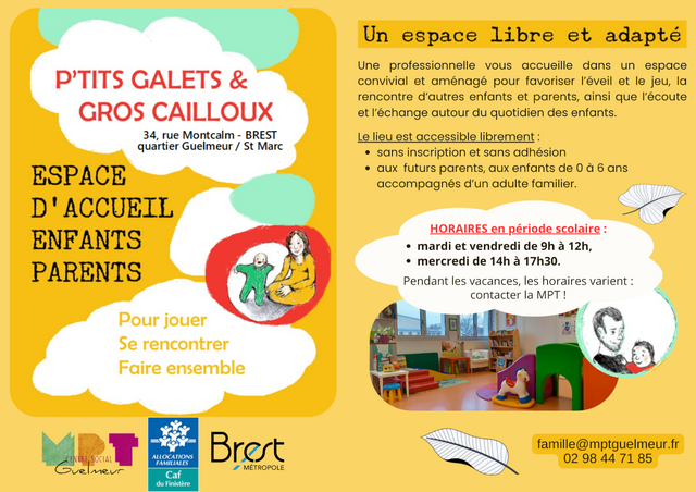 La MPT du Guelmeur à Brest invite parents et tout-petits sur son espace d’accueil enfants/parents "P’tits galets et gros cailloux", un espace convivial et aménagé pour favoriser l’éveil et le jeu, la rencontre d’autres enfants et parents, ainsi que l’écoute et l’échange autour du quotidien des enfants.