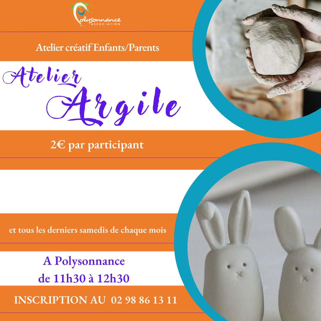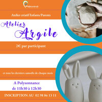 Atelier parents/enfants autour de l’argile à Châteaulin Samedi 25 avril | Catégories : Autour de la petite enfance, Autour de l’enfance, Sortir en famille Description Polysonnance à Châteaulin propose tous les derniers samedis du mois un atelier créatif enfants/parents autour de l’argile. De 11h30 à 12h30 Sur inscription : 02 98 86 13 11 Tarif : 2 € par participant Localisation Polysonnance - Châteaulin