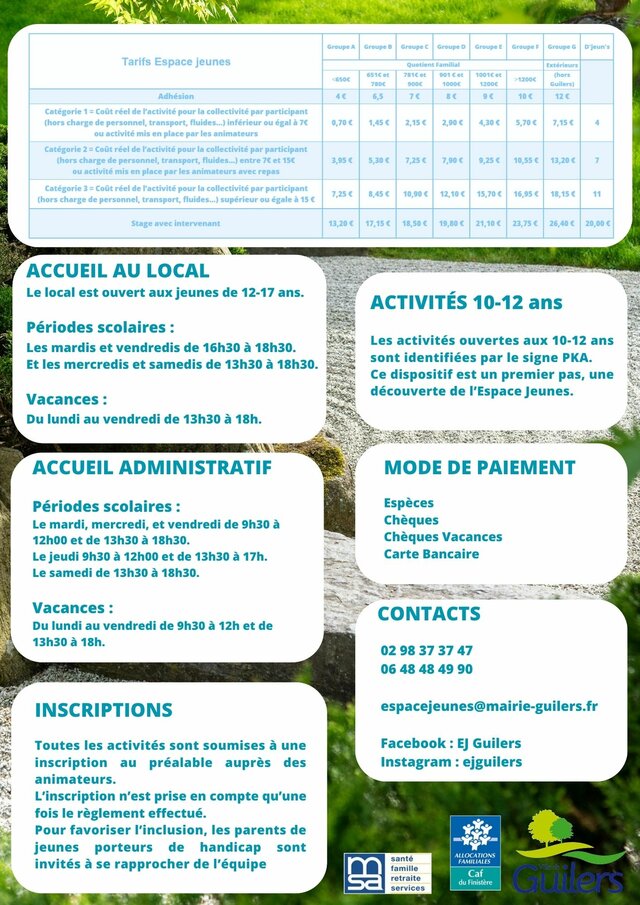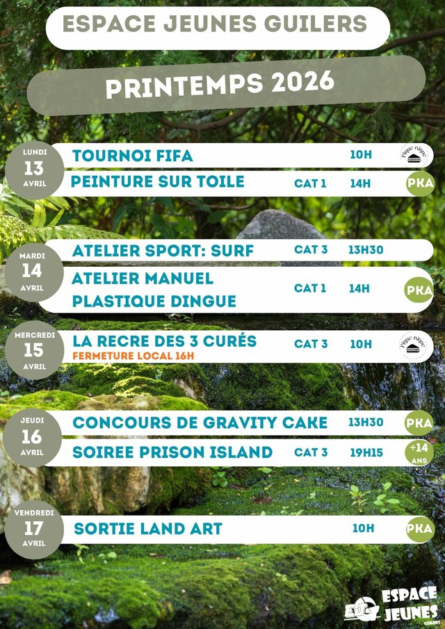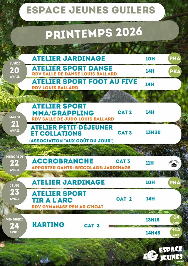 Sports, ateliers manuels, cuisine, sorties... activités variées avec l’espace jeunes de Guilers Lundi 20 avril | Catégories : Autour de la jeunesse Description L’espace jeunes de Guilers propose un programme d’activités pendant les vacances de printemps. Programme, tarifs, coordonnées de renseignements et d’inscriptions ci-après : Localisation Espace jeunes - Guilers
