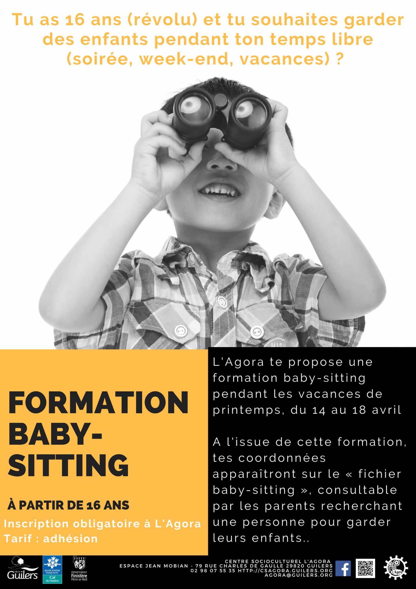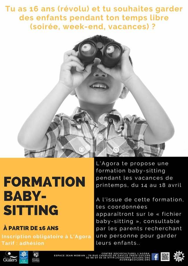 Formation baby-sitting à Guilers Du 14 au 18 avril | Catégories : Autour de la jeunesse Description L’Agora à Guilers propose aux jeunes à partir de 16 ans une formation baby-sitting pendant les vacances de printemps, du 14 au 18 avril. Inscription et adhésion à l’Agora : 02 98 07 55 35 Localisation L’Agora - Guilers