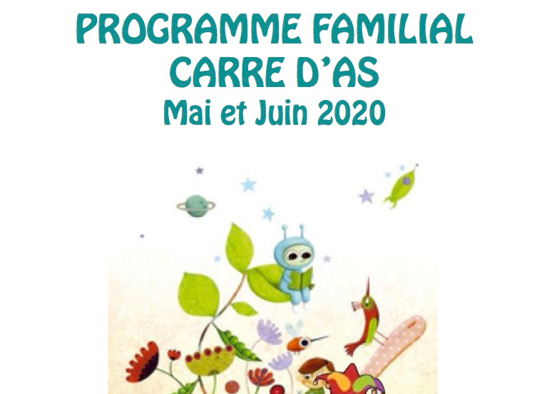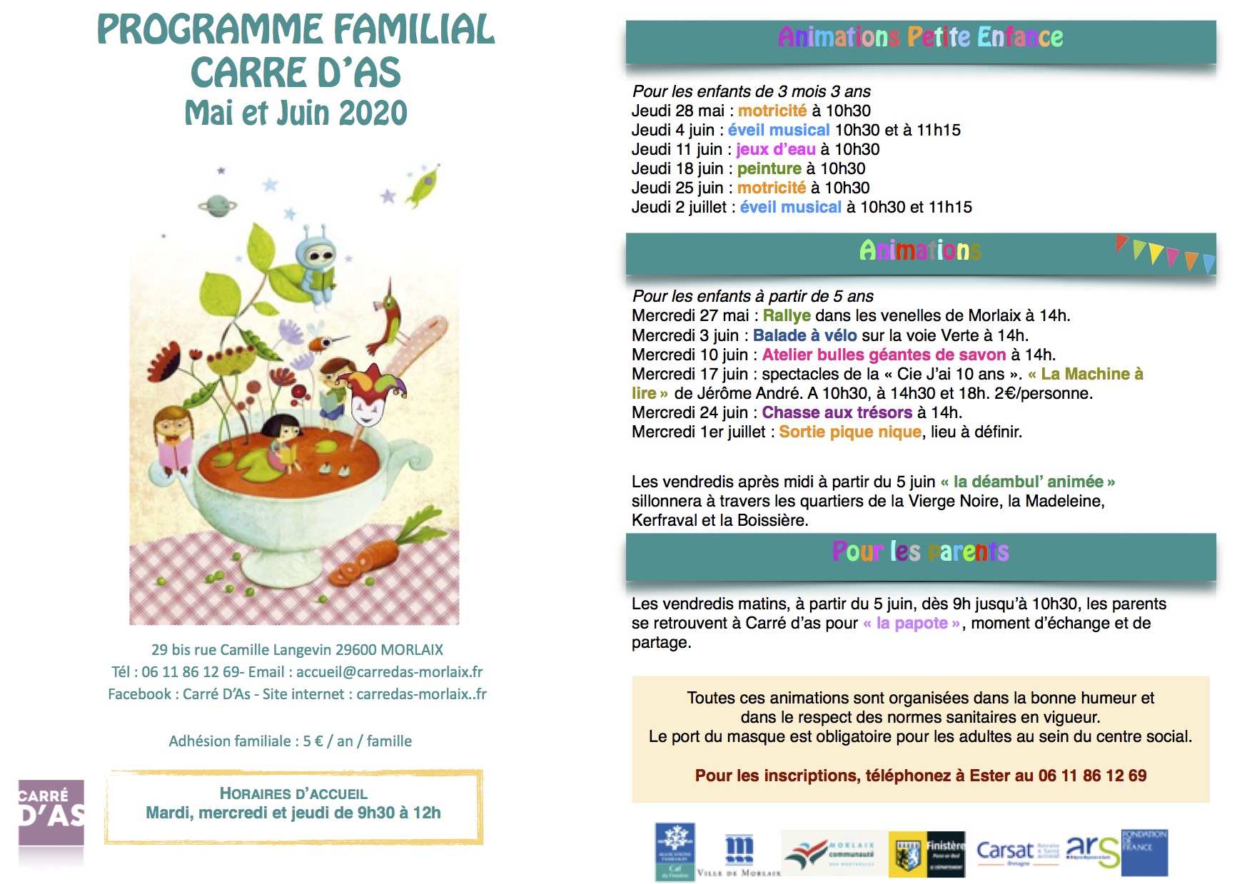 Programme familial en juin avec Carré d’as à Morlaix Vendredi 19 juin 2020 | Catégories : Sortir en famille, Aide aux parents Description Le centre social Carré d’as à Morlaix propose un programme pour les familles sur le mois de juin : des animations pour les petits de 3 mois à 3 ans, pour les enfants à partir de 5 ans et pour les parents. Localisation Carré d’As - Morlaix