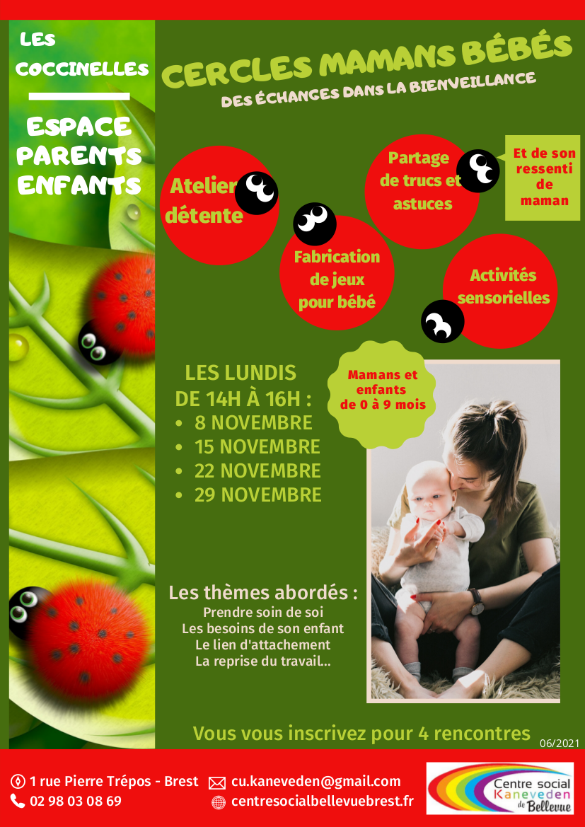 Dans le cadre de l’espace parents/enfants du centre social de Bellevue à Brest, "Les Coccinelles" proposent "Le cercle Mamans-Bébés", des temps dédiés pour les mamans avec leurs bébés de 0 à 9 mois, avec des ateliers et échanges.