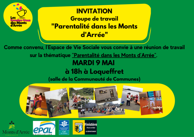 Groupe de travail "Parentalité dans les Monts d’Arrée" Mardi 9 mai 2023 | Catégories : Aide aux parents Description L’espace de vie sociale "Rendez-vous dans les Monts d’Arrée" invite les habitants de participer au groupe de travail "Parentalité dans les Monts d’Arrée" Mardi 9 mai à 18h à Loqueffret (salle de la Communauté de Communes).