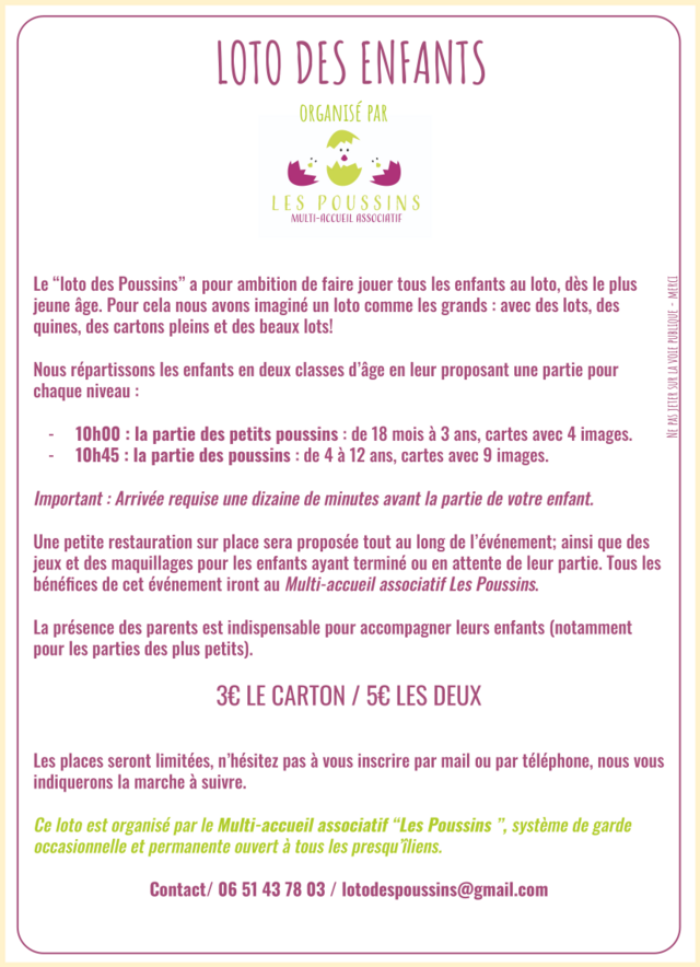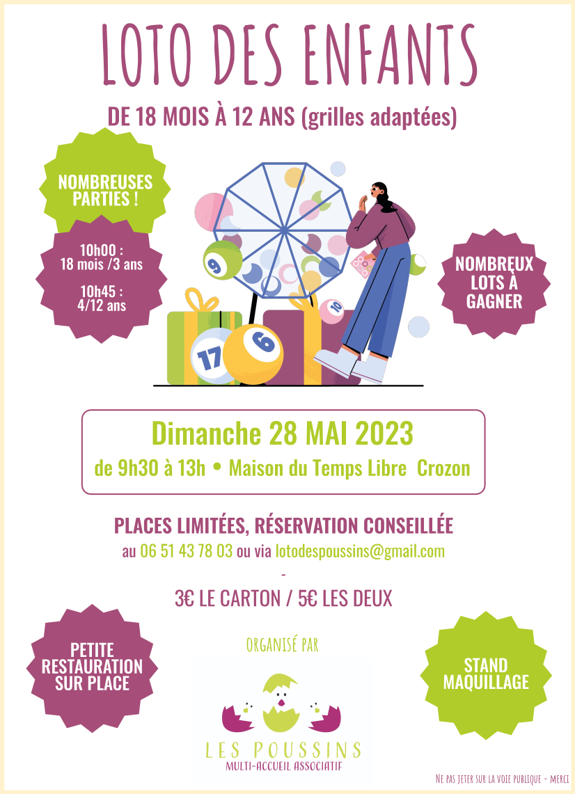 Loto pour les enfants à Crozon Dimanche 28 mai 2023 | Catégories : Autour de l’enfance, Sortir en famille Description La crèche associative "Les poussins" à Crozon organise un loto pour les enfants de 18 mois à 12 ans au profit de l’association le dimanche 28 mai de 9h30 à 13h - Maison du Temps libre. Localisation Maison du temps libre - Crozon