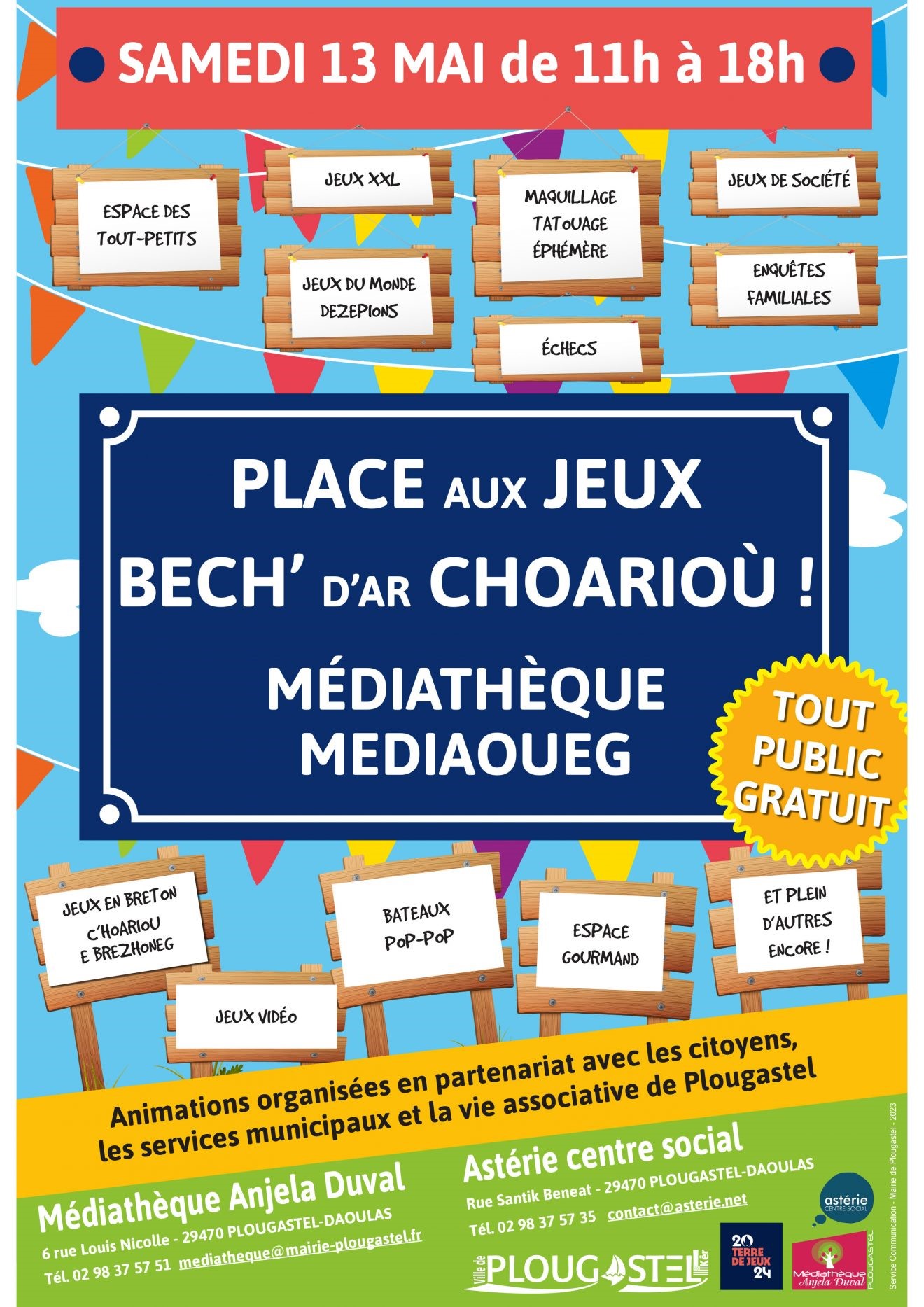 Samedi 13 mai de 11h à 18h : Fête du jeu, Animations pour toute la famille sur le parvis de la Médiathèque Anjela Duval à Plougastel-Daoulas.