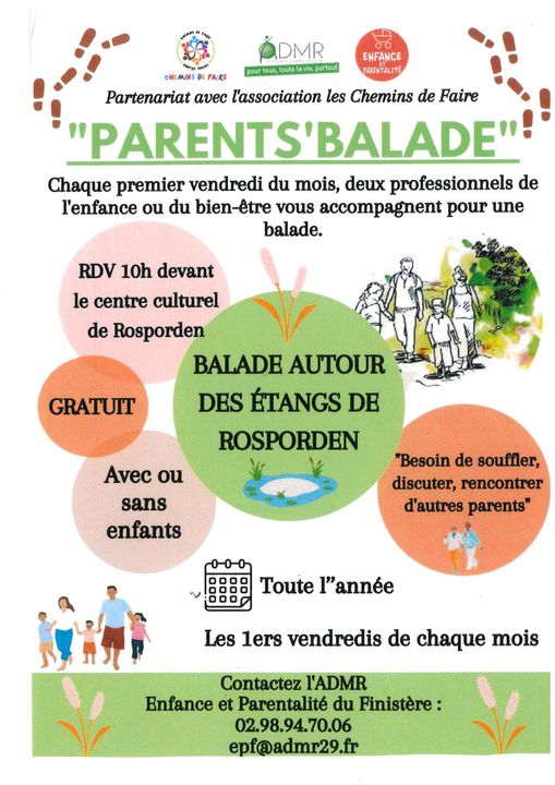 L’ADMR en partenariat avec Chemins de faire propose aux parents de se retrouver avec ou sans enfant pour une petite promenade à pied autour des étangs de Rosporden 1 vendredi par mois.