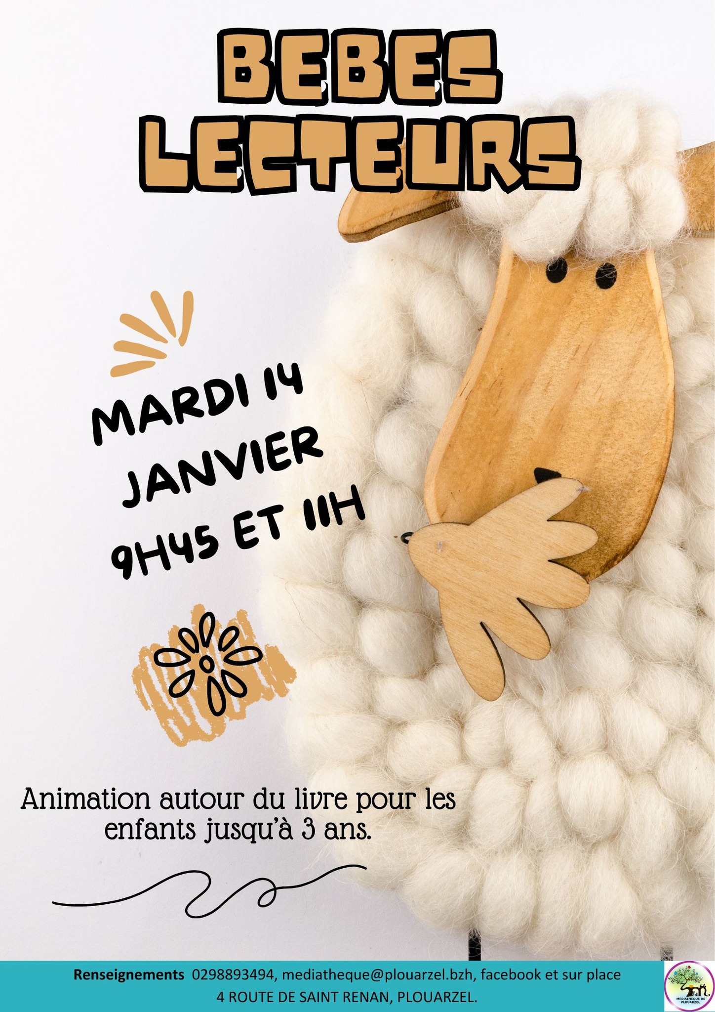 "Bébés lecteurs", animation autour du livre à Plouarzel pour les enfants jusqu’à 3 ans Mardi 14 janvier | Catégories : Autour de la naissance, Autour de l’enfance, Sortir en famille Description La médiathèque de Plouarzel organise une matinée jeux pour les bébés Renseignements : 02 98 89 34 94 Localisation Médiathèque - Plouarzel