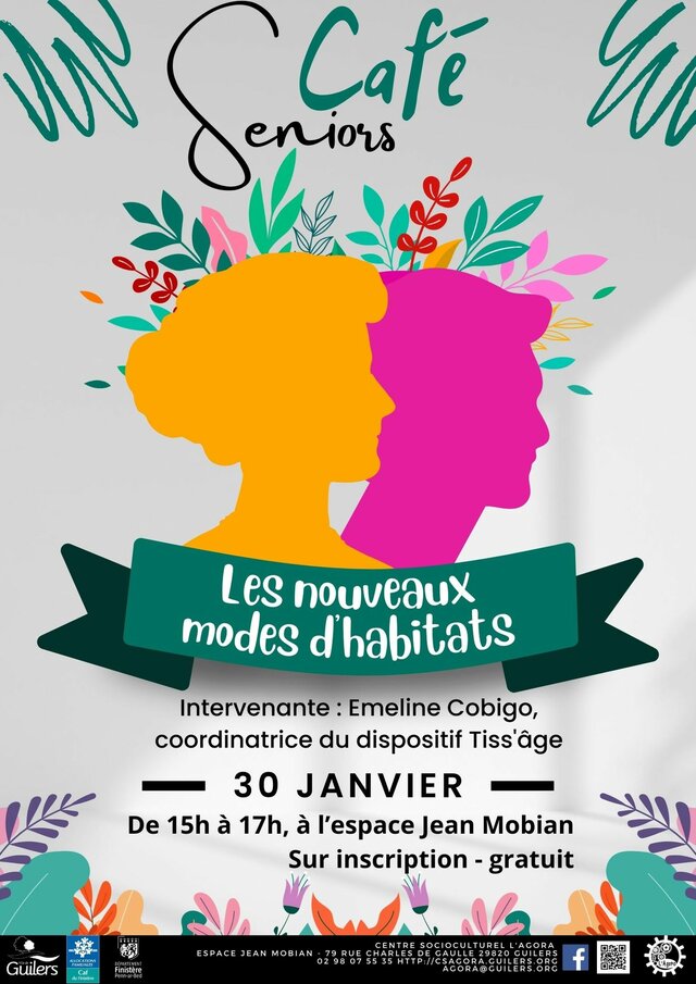 Café sénior à Guilers : "les nouveaux modes d’habitats" Jeudi 30 janvier | Catégories : Place aux grands-parents Description Un café sénior se tient jeudi 30 janvier 2025 de 15h à 17h à l’espace Jean Mobian à Guilers pour échanger sur les nouveaux modes d’habitats avec l’intervention Emeline Cobigo, coordinatrice du dispositif Tiss’âge. Gratuit. Localisation Espace Jean Mobian - Guilers